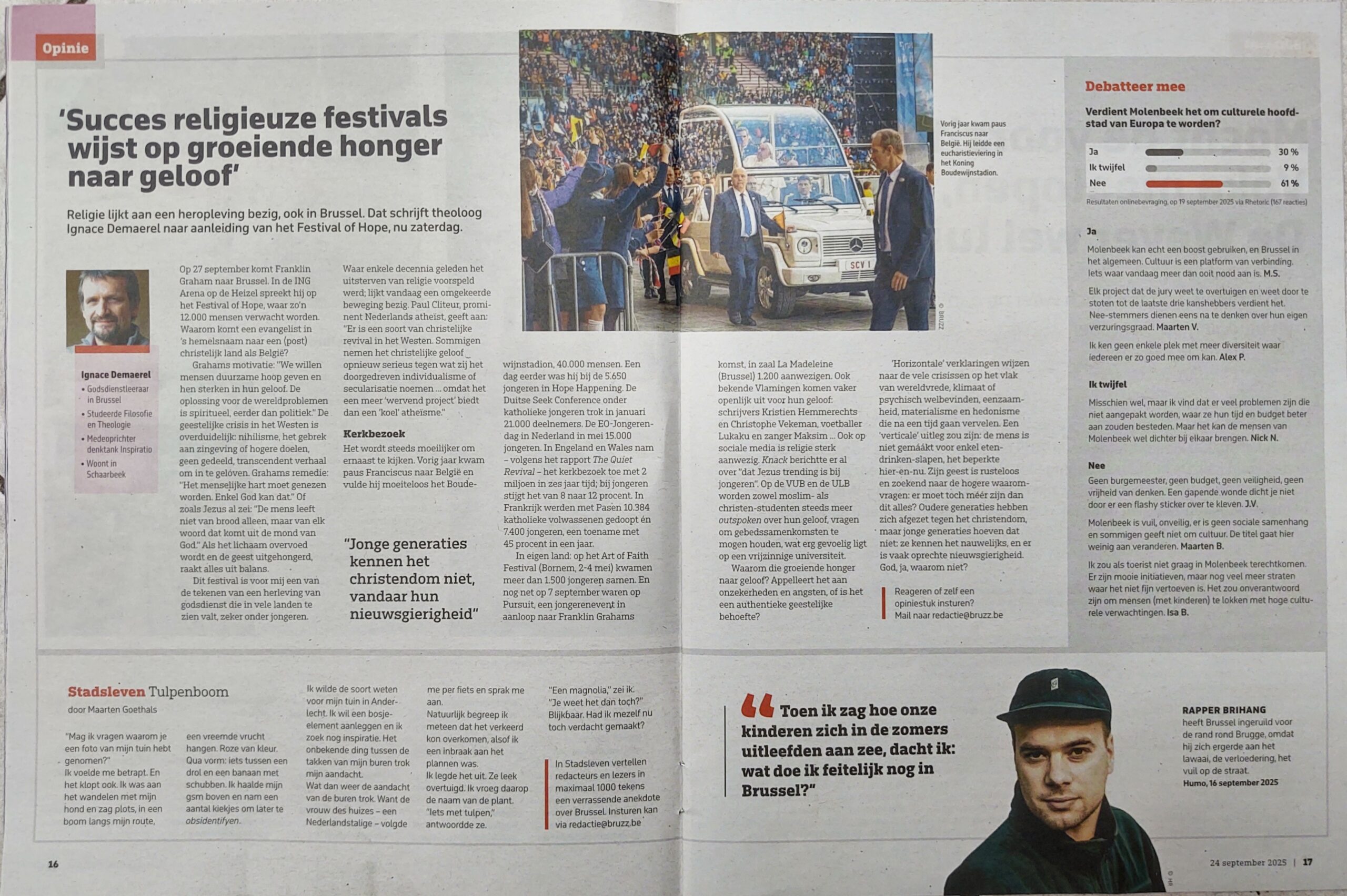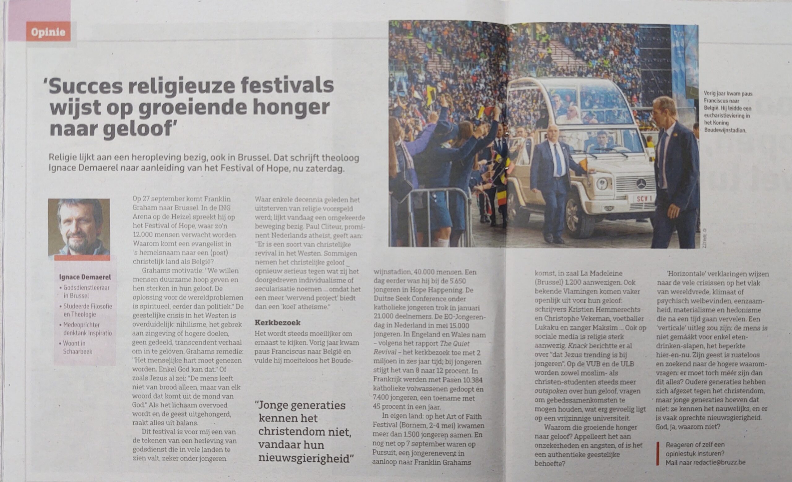 Vandaag (24-09) verscheen een artikel van mijn hand in de Bruzz, hét magazine voor de Brusselse Vlamingen. Naar aanleiding van het Festival of Hope met Franklin Graham (zaterdag 24 sept, ING Arena, Brussel, 18u) heb ik mogen schrijven over de algemene beweging van de herleving van geloof in westerse landen vandaag, en zeker bij jongeren. Ik vond het zelf boeiend om wat cijfers hierover te verzamelen.