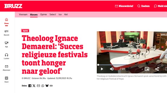 De dag na het artikel in de Bruzz hebben ze mij gevraagd voor een live interview (25-09, 8u45), dat heel vlot, ontspannen en open gebeurde. Hier kan je de opname bekijken en beluisteren (7 min.): https://www.bruzz.be/actua/opinie/theoloog-ignace-demaerel-succes-religieuze-festivals-toont-honger-naar-geloof-2025-09
